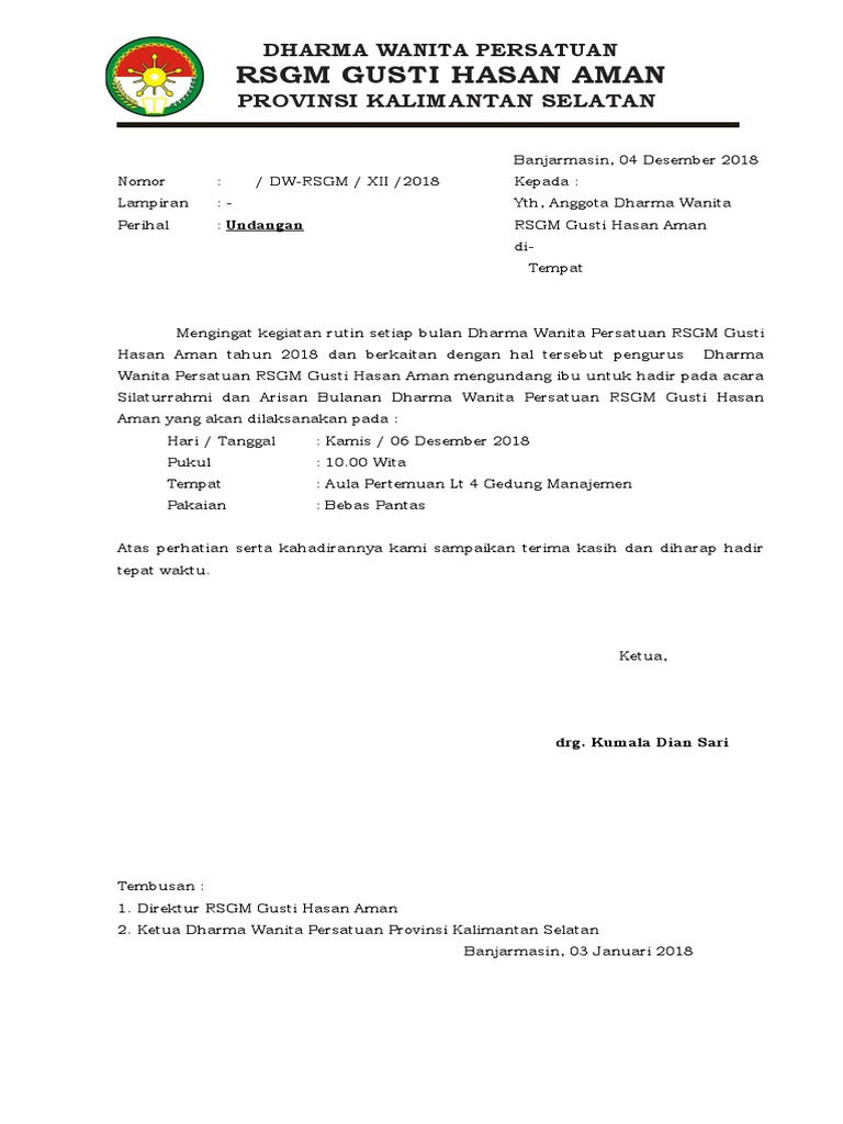 Dharma wanita persatuan adalah organisasi kemasyarakatan yang menghimpun dan membina istri pegawai negeri sipil ri dengan kegiatan yang bergerak dalam bidang pendidikan, ekonomi dan sosial budaya serta tidak terkait dengan kekuatan politik manapun, tetapi hak berpolitik anggota tetap dihormati. ( contoh 1 ) teks pembawa acara ( mc ) dharma wanita terbaik assalamu’alaikum wr. Ralat undangan darma wanita telah diposting dengan harapan bahwa kami dapat memberi anda inspirasi untuk membuat kop surat dengan baik dan benar.