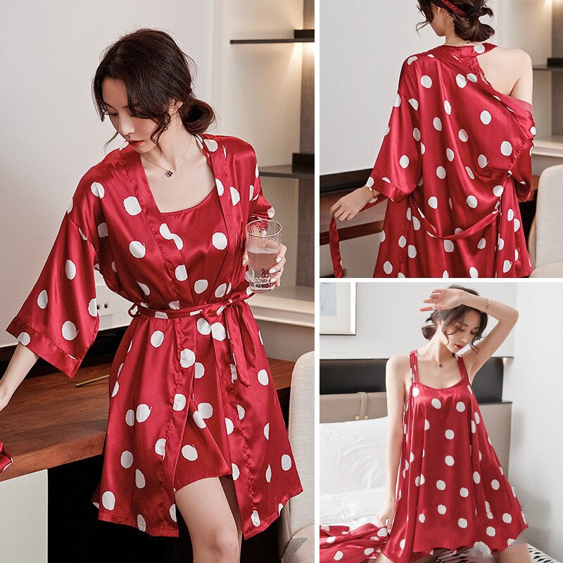 Pijamas Sets Polka Dot Dress Satin Pyjamas Baju Tidur Wanita Silk