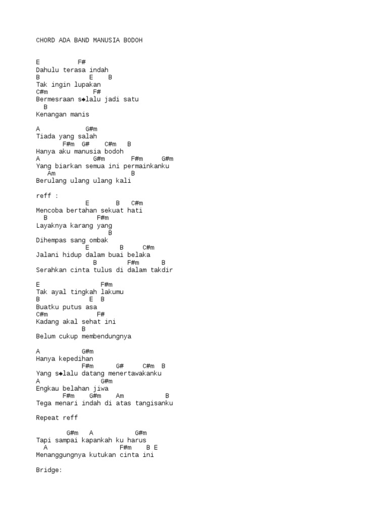 Berikut ini chord gitar dan lirik lagu karena wanita ingin dimengerti yang dipopulerkan oleh grub musik ada band. Ditulis oleh irfan blogger 02.24. [coda] f#m d a e.